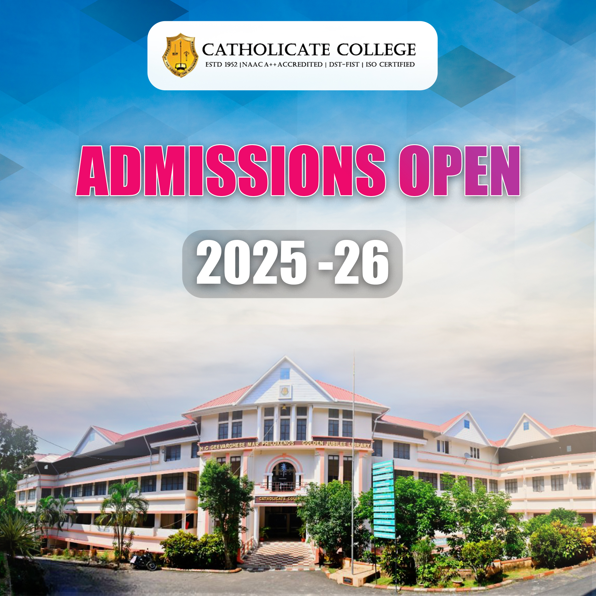 Catholicate College owes its existence to the innate vision of the greatly lamented H.H Baselios Geevarghese II, the Catholicos of the Malankara Orthodox Church and H.G. Puthencavil Geevarghese Mar Philoxenos, the then Metropolitan of Thumpamon Diocese. The college had the prayerful guidance of H.G.Daniel Mar Philoxenos, the first principal of the college, and who later became the Metropolitan of Thumpamon Diocese. Our Vision: To create an educated enlightened society for a brave new world.Our Mission: Academic excellence for a better society perseverance for better growth.
