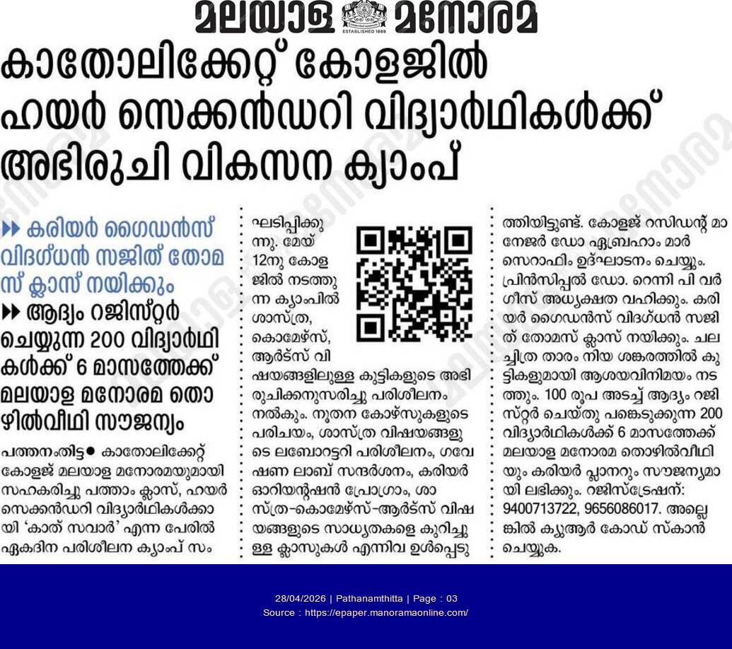 Catholicate College,Pathanamthitta is the pioneer educational institution under the Malankara Orthodox Church.Being the local manager,the college is blessed with talented professors and enthusiastic students.